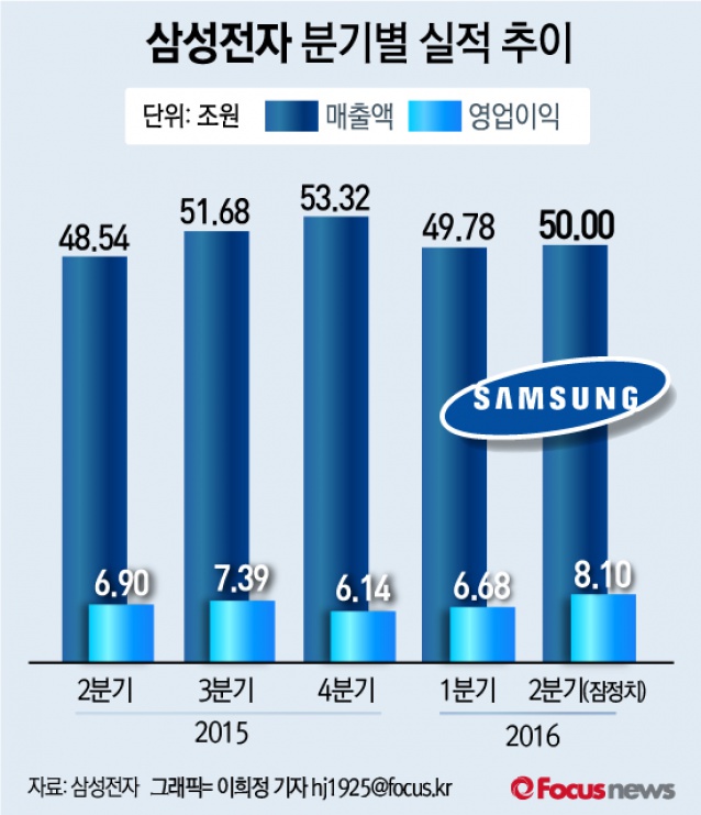 이세철 NH투자증권 연구원은 "2016년 하반기는 애플 신제품 효과로 스마트폰 실적 둔화가 전망된다"면서도 "3D NAND 실적 확대에 따른 반도체 실적 개선 및 디스플레이 회복으로 분기 7조원대 이익이 지속될 것으로 예상된다"고 밝혔다.