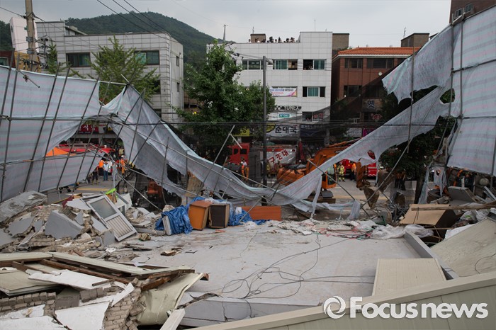 (서울=포커스뉴스) 18일 오후 서울 서대문구 홍은동 한 공사장 건물이 붕괴되어 있다. 소방당국은 붕괴된 건물 지하에 1명이 매몰되어 있다고 밝혔다.