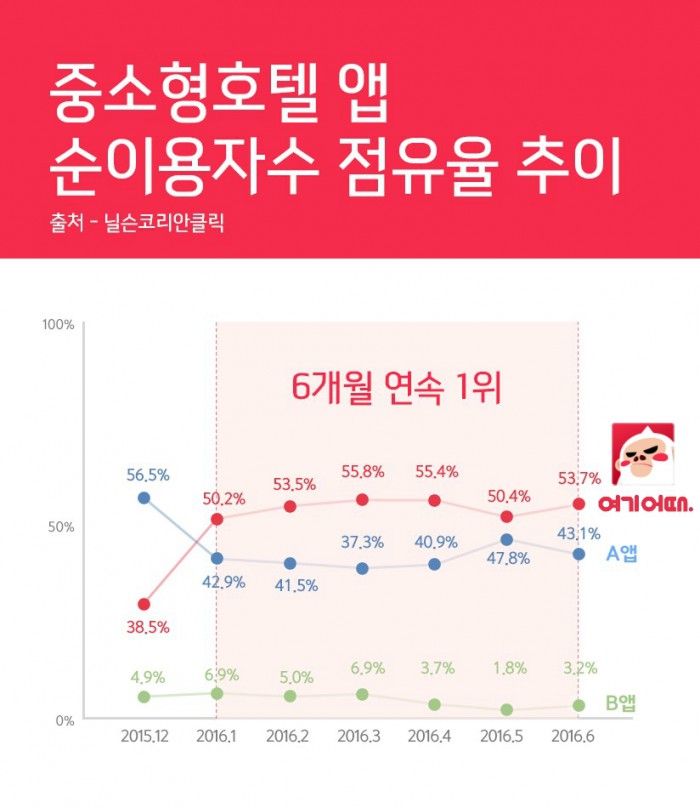 '여기어때'의 중소형호텔 중개시장 점유율은 지난 1월 이후 6개월 연속 50% 이상을 유지 중이다. 이번 조사 발표결과, 6월 역시 53.7%를 기록, 시장 점유율 과반을 차지했다. 반면, A사는 43.1%, B사 3.2%였다.