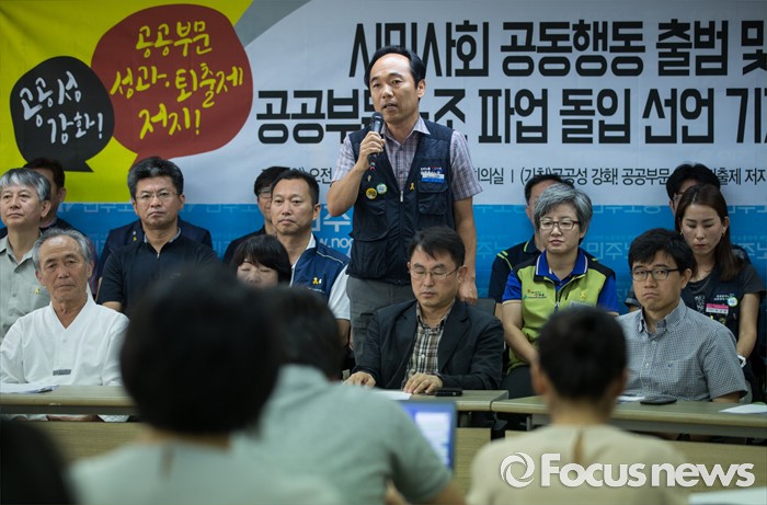 (서울=포커스뉴스) 19일 오전 서울 중구 민주노총 대회의실에서 시민 사회 공동행동 출범 및 공공부문노조 파업 돌입 선언 기자회견이 열리고 있다. 공공성 강화와 공공부문 성과·퇴출제 저지 시민사회공동 행동은 9월 27일까지 성과연봉제, 민영화 정책 중단이 없으면 공공기관 노동자 6만명이 무기한 전면 파업에 돌입 한다고 밝혔다.