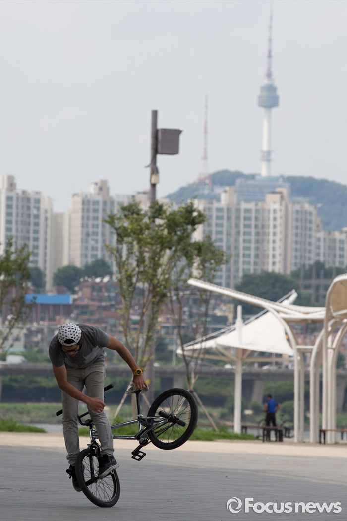(서울=포커스뉴스) 서울 지역에 폭염주의보가 내린 19일 오후 서울 서초구 반포한강공원 일대에서 한 시민이 자전거 묘기 연습을 하고 있다.