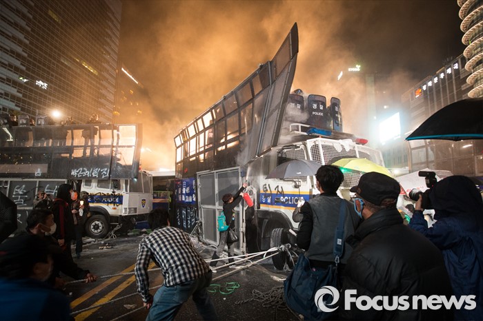 | △ 차벽 위로 소화기를 뿌리 시위대 |
