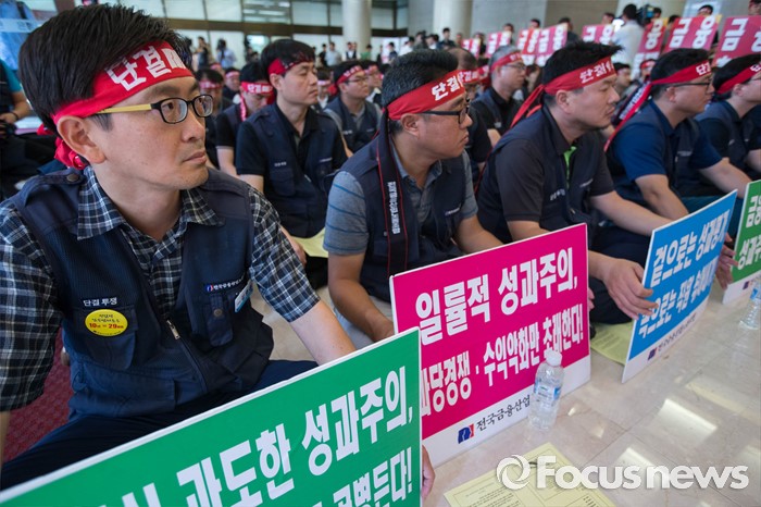 (서울=포커스뉴스) 20일 오전 서울 중구 은행회관에서 금융노조의 '성과연봉제 도입 관련 총파업 1차 결의대회' 가 열리고 있다.