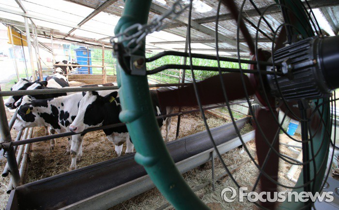 (세종=포커스뉴스) 폭염주의보가 발령된 20일 오후 세종시 한 농장에서 젖소들이 선풍기 바람에 더위를 식히고 있다.
