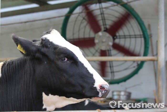 (세종=포커스뉴스) 폭염주의보가 발령된 20일 오후 세종시 한 농장에서 젖소들이 대형 선풍기 바람에 더위를 식히고 있다.