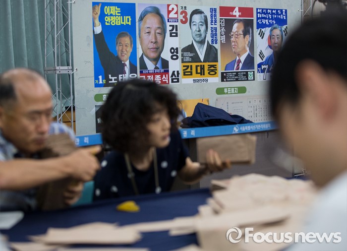 (서울=포커스뉴스) 20일 오전 서울 종로구 선거연수원에서 개표사무원들이 1987년 제13대 대통령선거 구로구을 우편투표함에서 꺼낸 투표용지를 계수하고 있다.