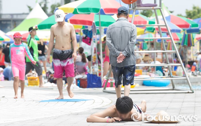 (서울=포커스뉴스) 21일 오후 서울 광진구 뚝섬 한강공원 수영장을 찾은 한 시민이 휴식을 취하며 휴대전화를 확인하고 있다.