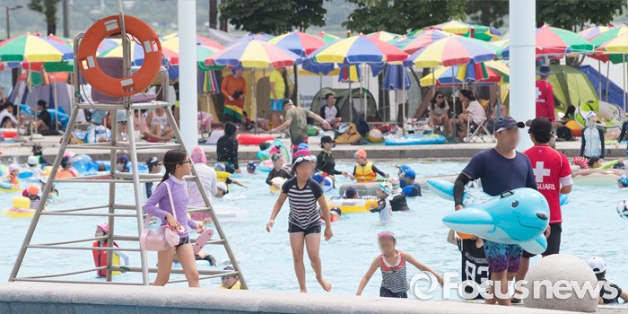 (서울=포커스뉴스) 21일 오후 서울 광진구 뚝섬 한강공원 수영장을 찾은 시민들이 물놀이를 즐기고 있다.