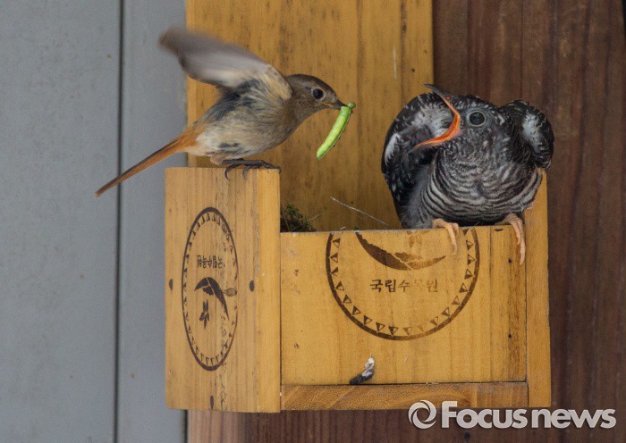 (포천=포커스뉴스) 딱새 암컷이포천 국립수목원 광릉숲에서 자신 보다 덩치가 2.5배나큰 뻐꾸기 새끼를 자기 자식으로 착각, 먹이를 잡아다 주고 있다.