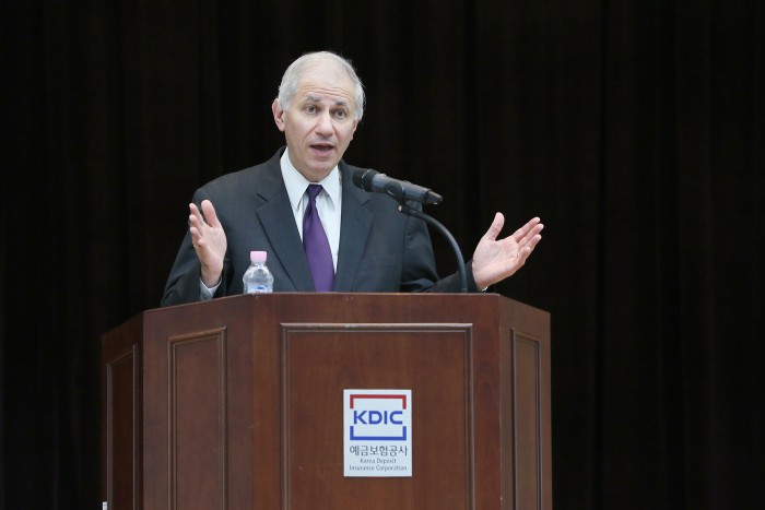 마지막으로 그는 전세계적으로 금융이 유기적으로 연결된 만큼 국제적 상호협력이 필요하다고도 했다. 그룬버그 의장은 "금융위기 이후 대형 금융기관이 진출한 스위스, 영국, 유럽연합, 일본의 금융감독당국과 적극적으로 협조하고 있다"며 "한국의 예금보험공사와도 이 같은 협력을 강화할 것"이라고 말했다.마틴 그룬버그 미국 연방예금보험공사 의장이 28일 서울 중구 청계천로 예금보험공사 사옥에서 특별강연을 펼쳤다.<사진제공=예금보험공사>마틴 그룬버그 미국 연방예금보험공사 의장이 28일 서울 중구 청계천로 예금보험공사 사옥에서 특별강연을 진행했다.<사진제공=예금보험공사>